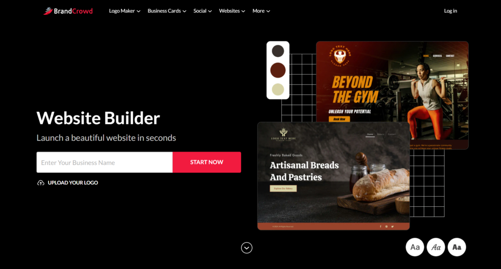 - Integrated branding tools — Access BrandCrowd’s logo maker, social media assets, and other design tools all within the same platform for a complete online identity.