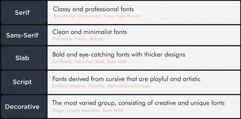 Then, it’s time to dive into the major typeface groups (serif, sans-serif, slab, script, and decorative) to understand what they represent and what message they convey.